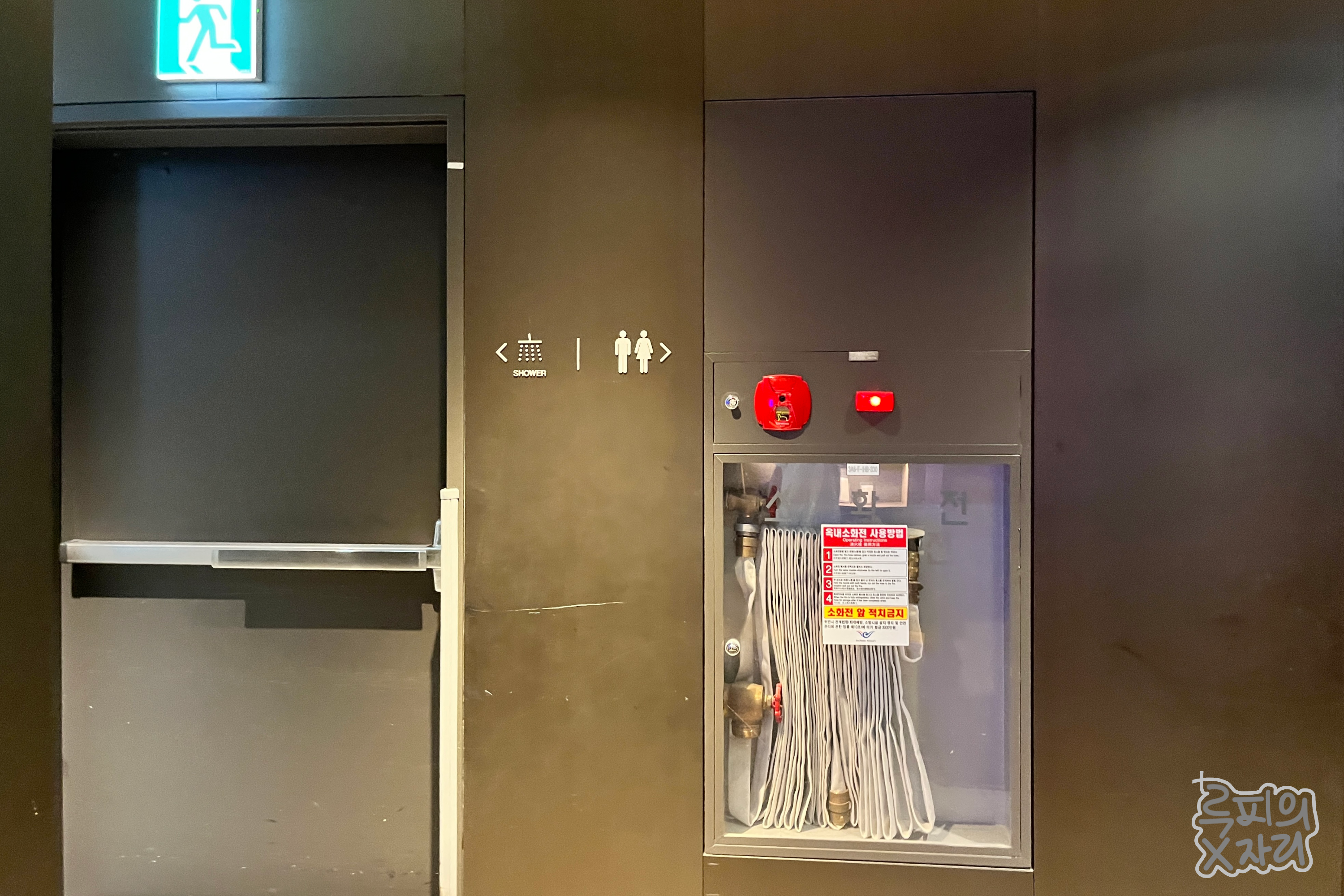 입장하자마자 비즈니스 테이블이 보입니다. 전원 공급을 받을 수 있는 아웃렛이 구비되어 있었습니다. 다음으론 복도가 나옵니다.