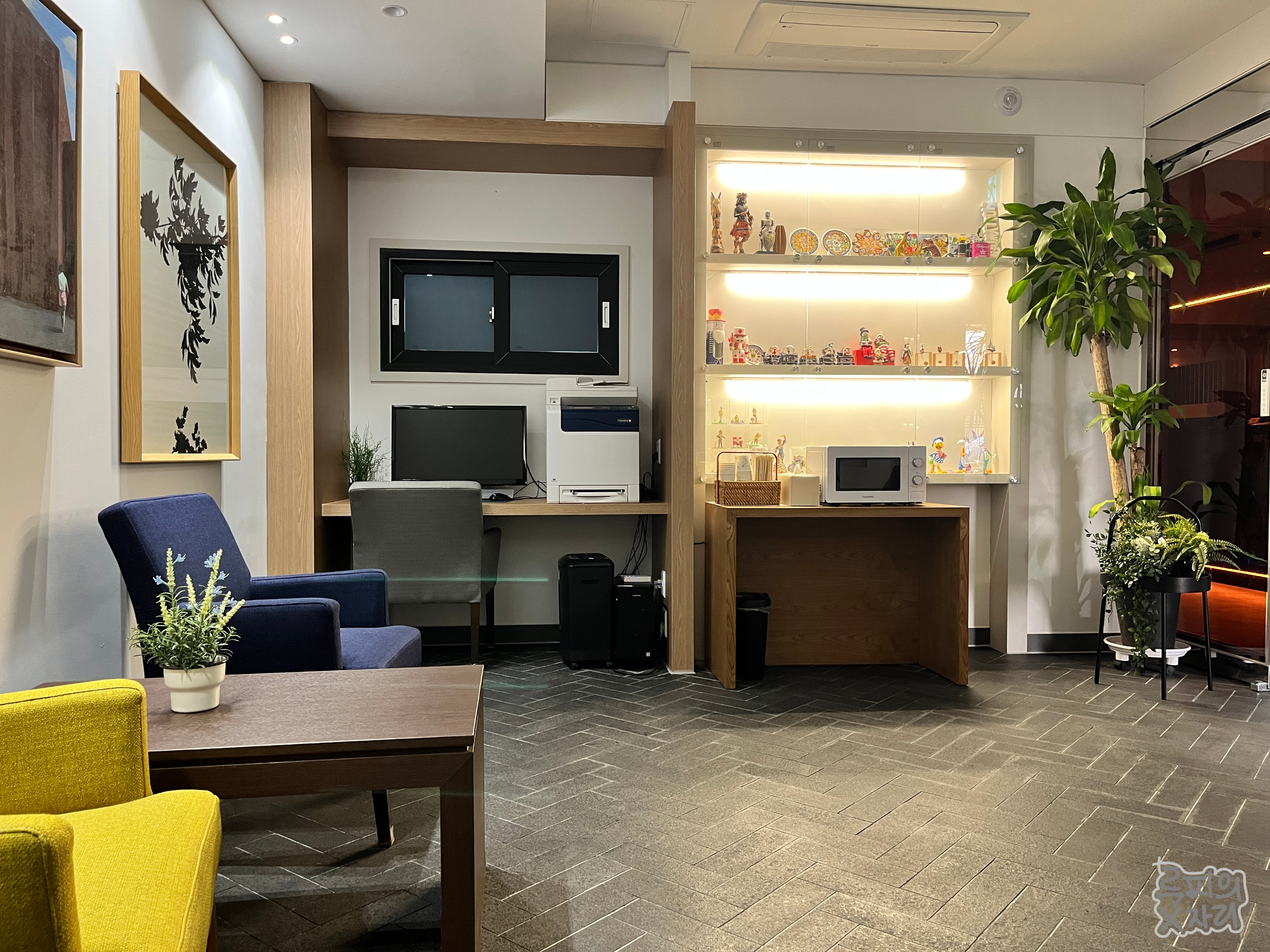 대구 누오보 호텔의 로비 라운지에는 꽤 10개쯤 꽤 많은 소파와 업무용 PC, 전자레인지가 있습니다.
