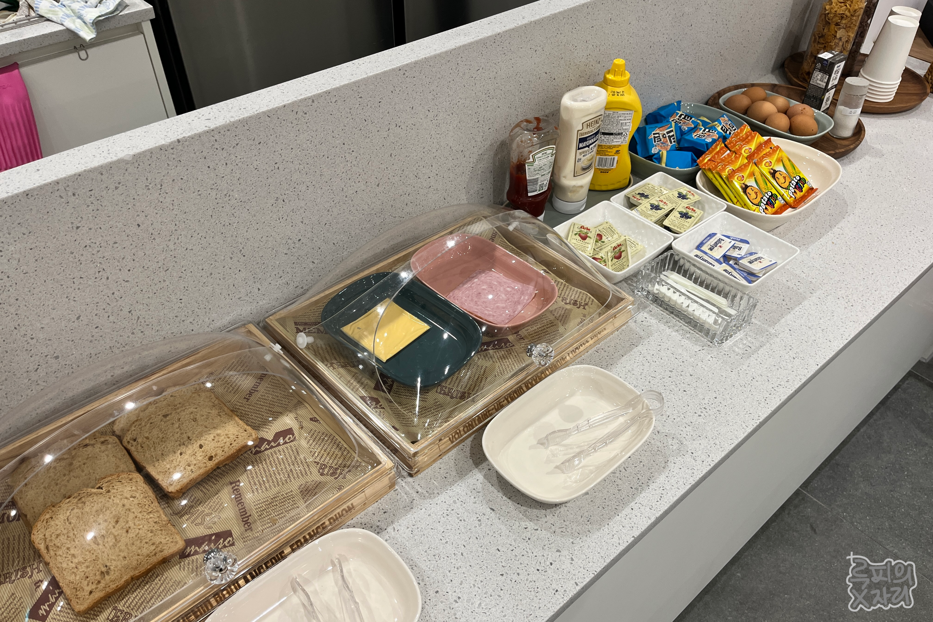 7~10시까지 제공되는 아침입니다. 보통 아침 시간이 아니더라도 입장시켜 물이나 라면등은 자유롭게 이용할 수 있는 출장 호텔이 많은데 이곳은 아침 시간에만 이용할 수 있게 제한을 두어 조금 아쉬웠습니다.