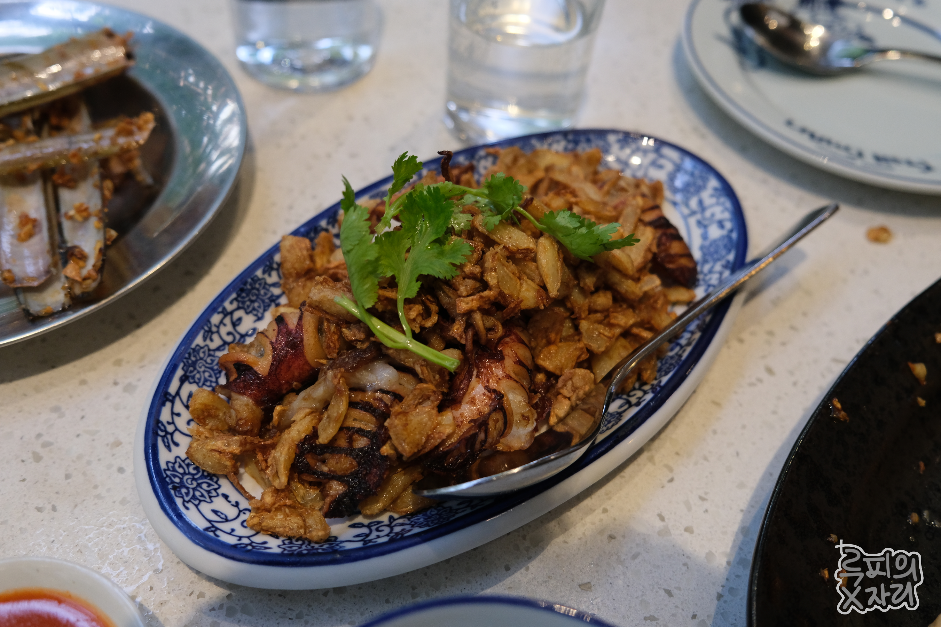 작은 오징어를 통째로 볶아낸 요리로, 독특한 식감을 자랑합니다.
