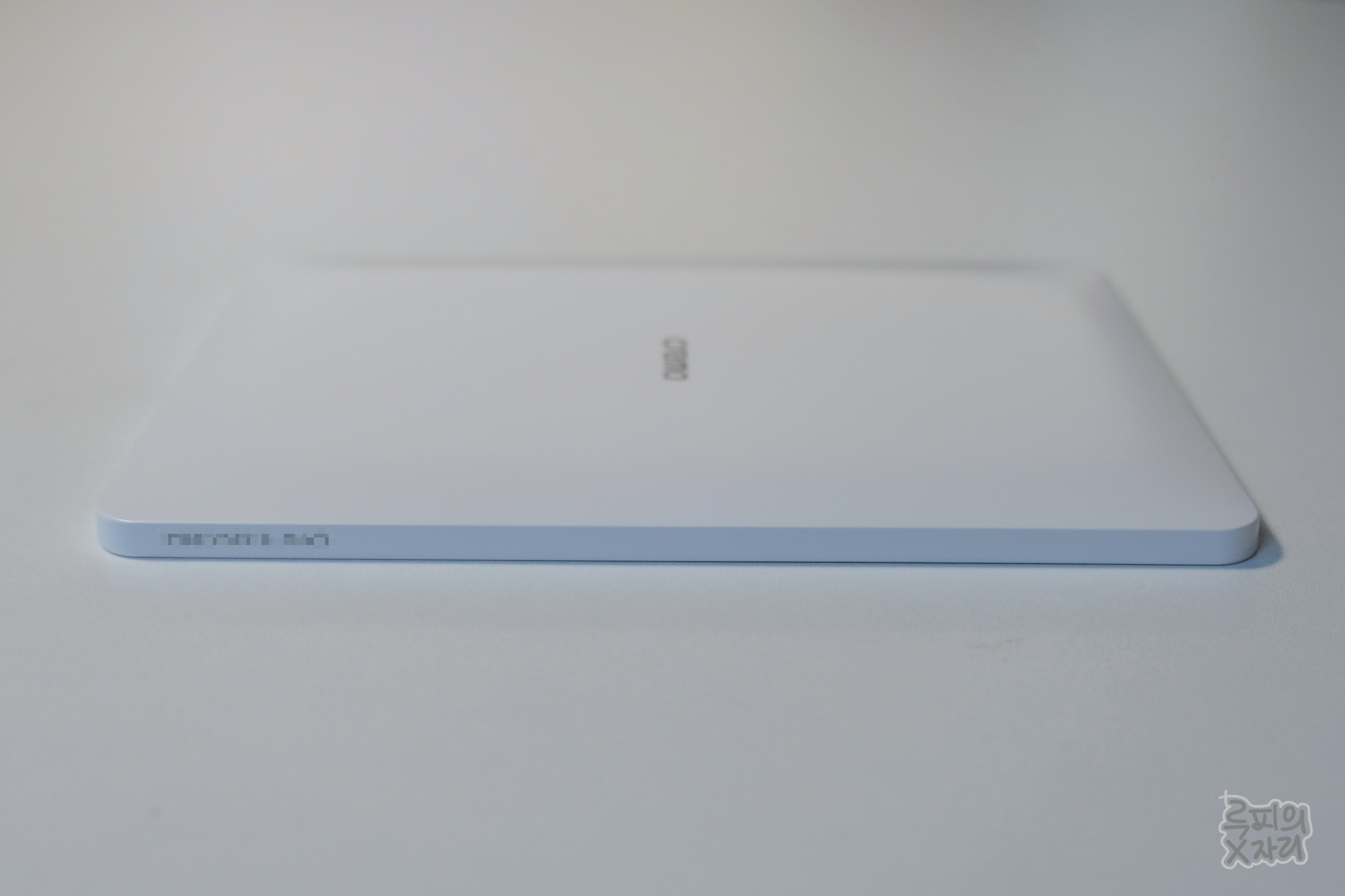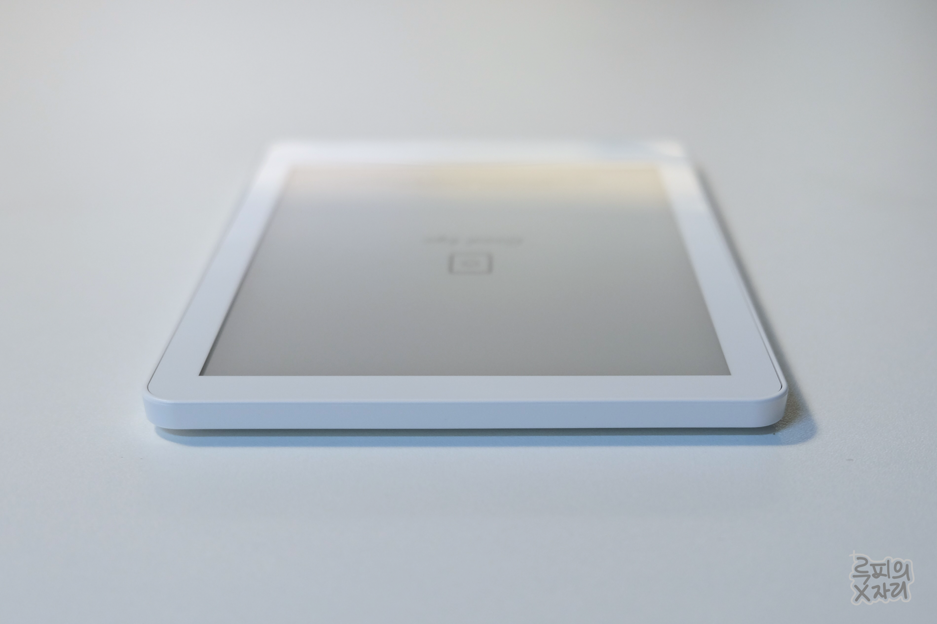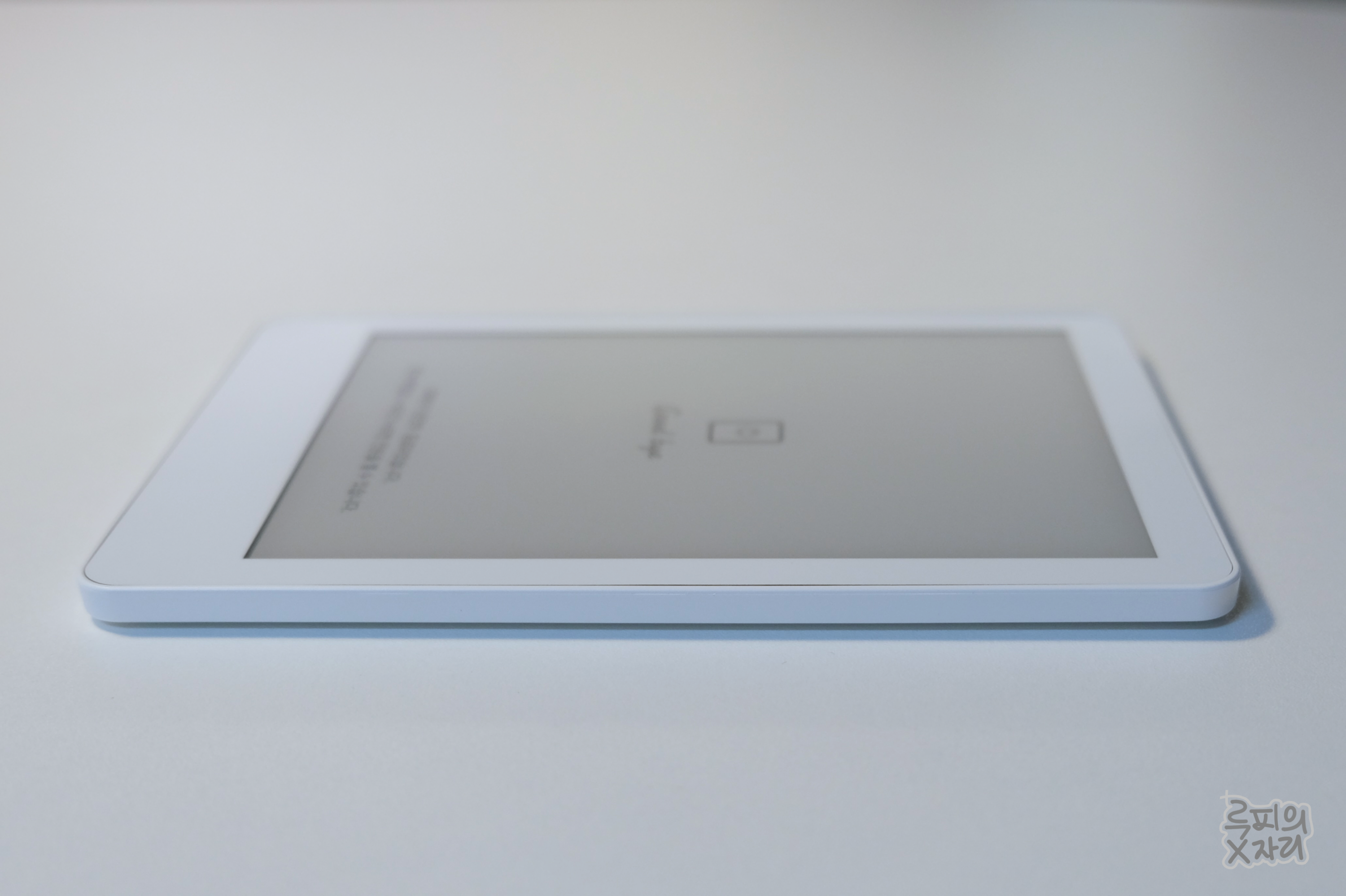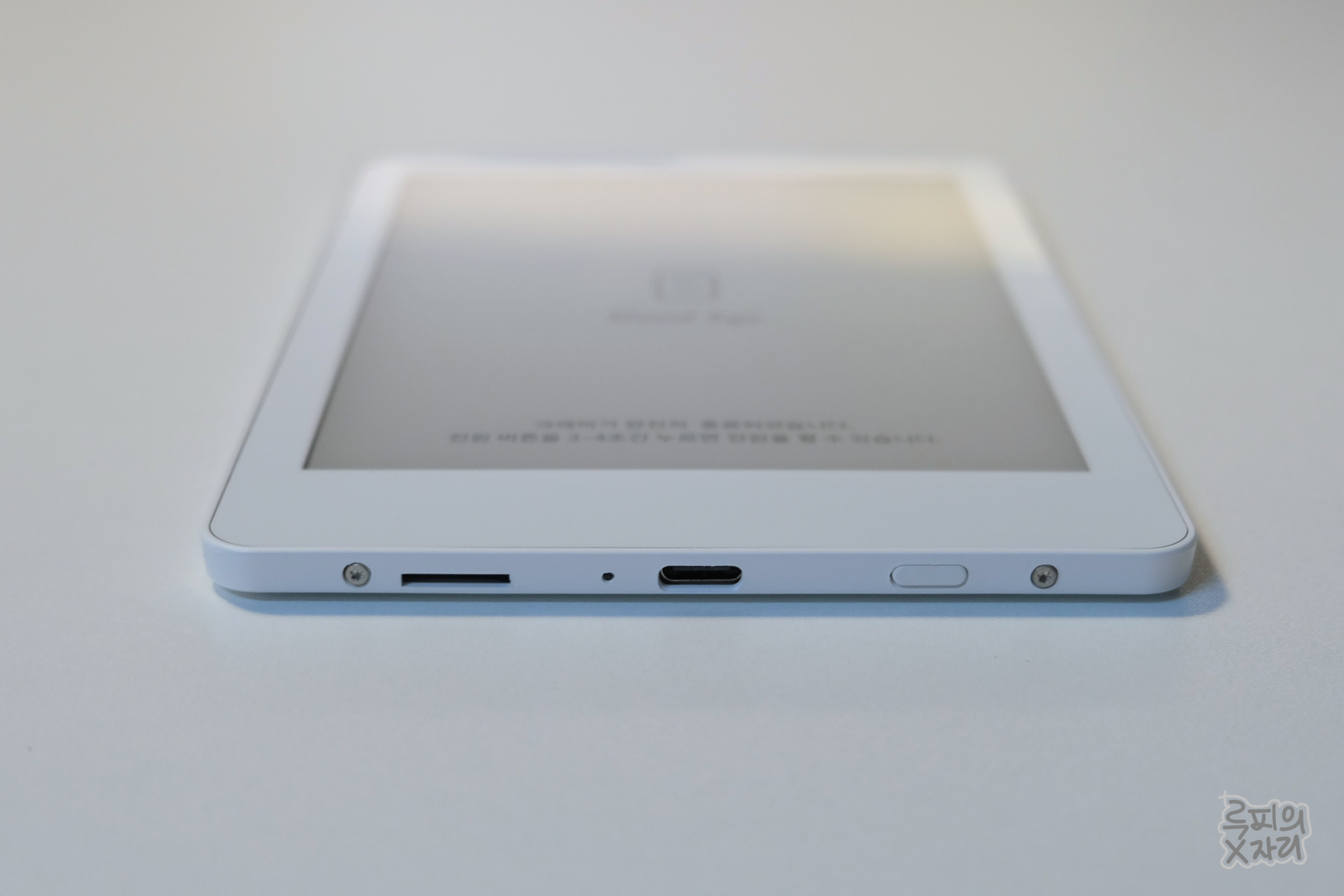 조립용 볼트, 확장용 SD 카드 슬롯, 충전 및 데이터 전송용 USB-C포트, 전원버튼이 자리하고 있다. 측면의 모든 부분을 비우고 전부 하단에 배치한 모습인데 전원버튼 정도는 측면 혹은 전면에 놓는 게 어땠을까 싶다. 그리고 3.5파이 이어폰잭이 없다. 가끔 읽기 귀찮을 때 오디오북을 사용하고 싶은데 무선 이어폰을 전자책에까지 페어링 해놓기는 좀 그렇지 않나?