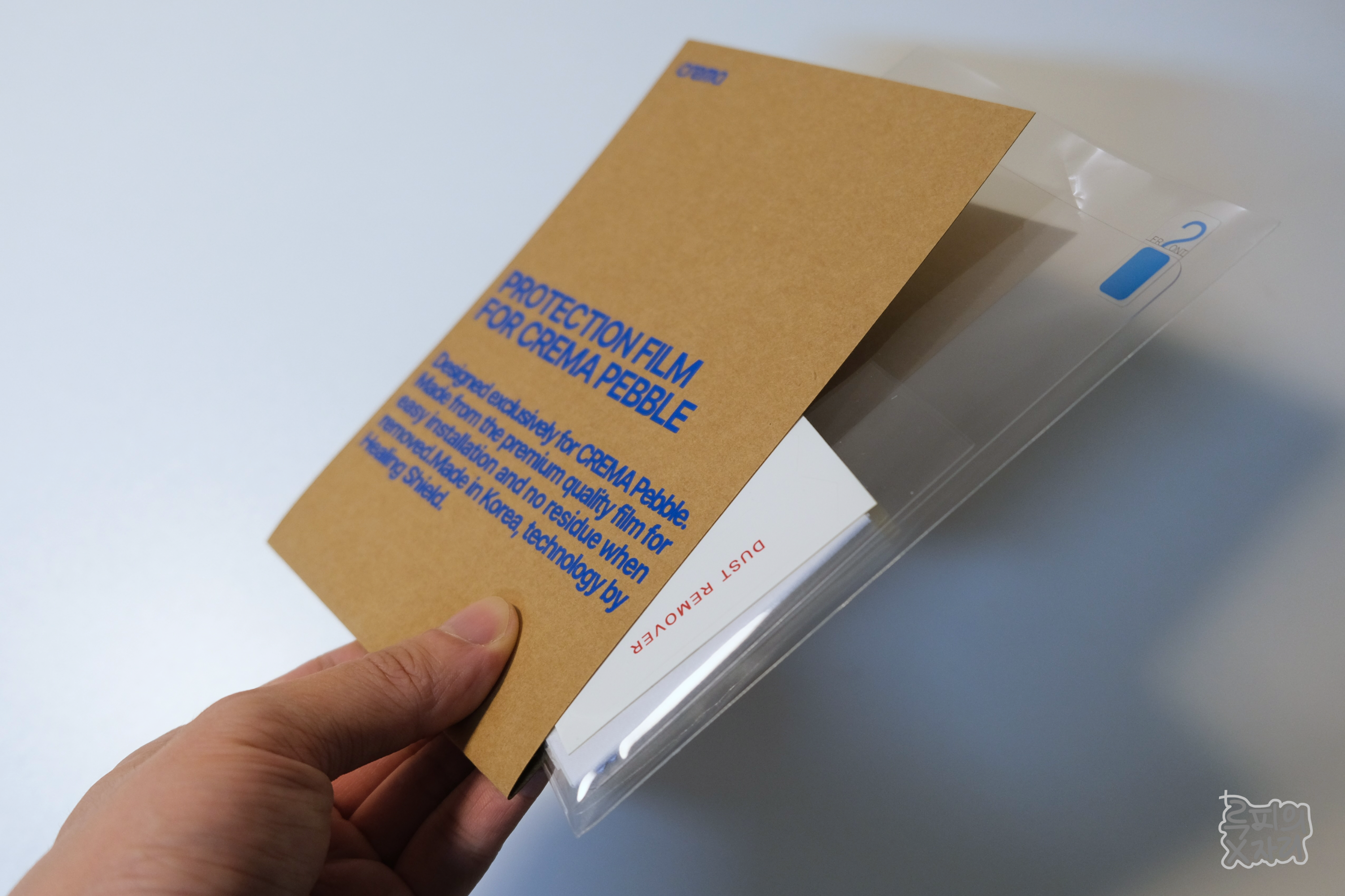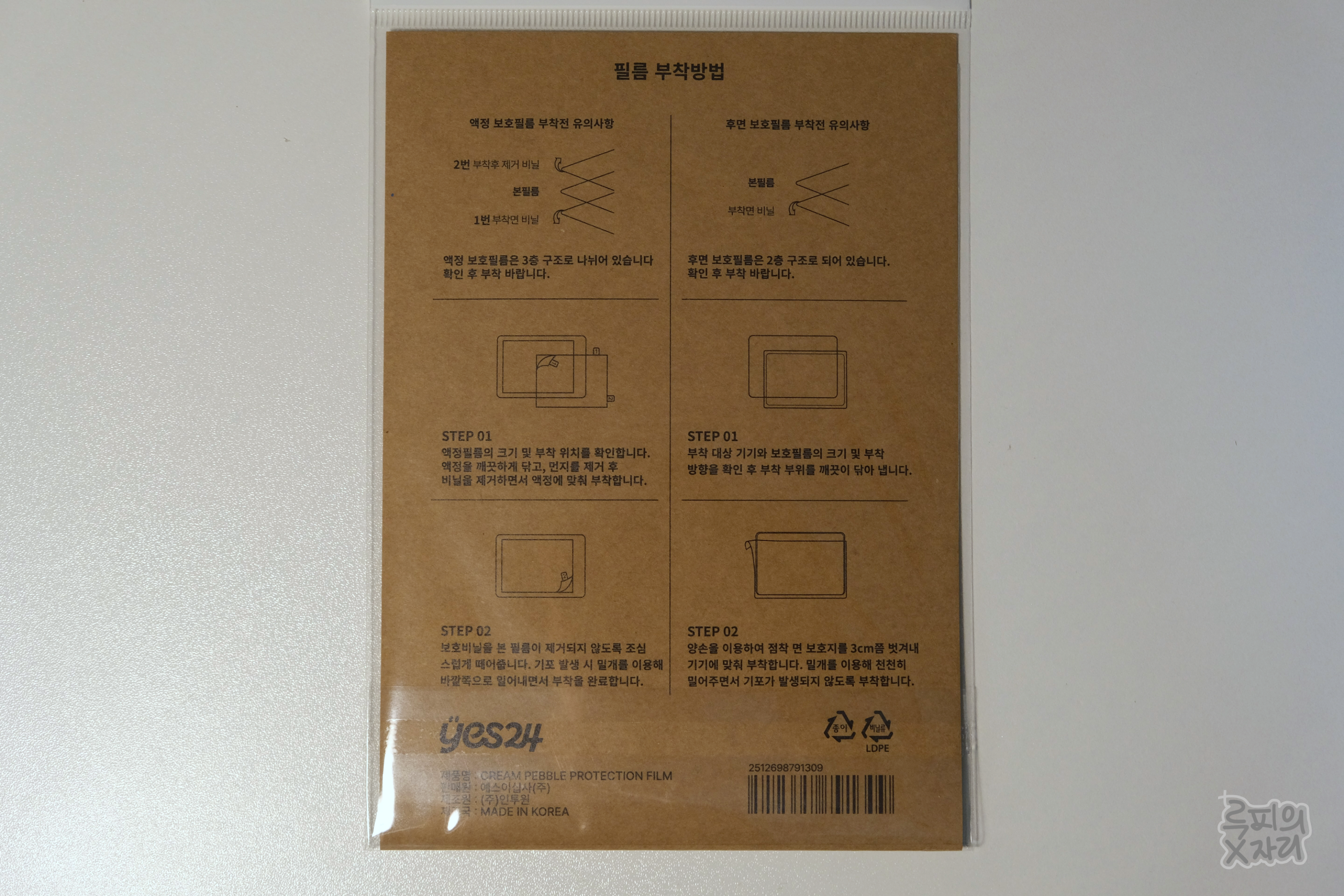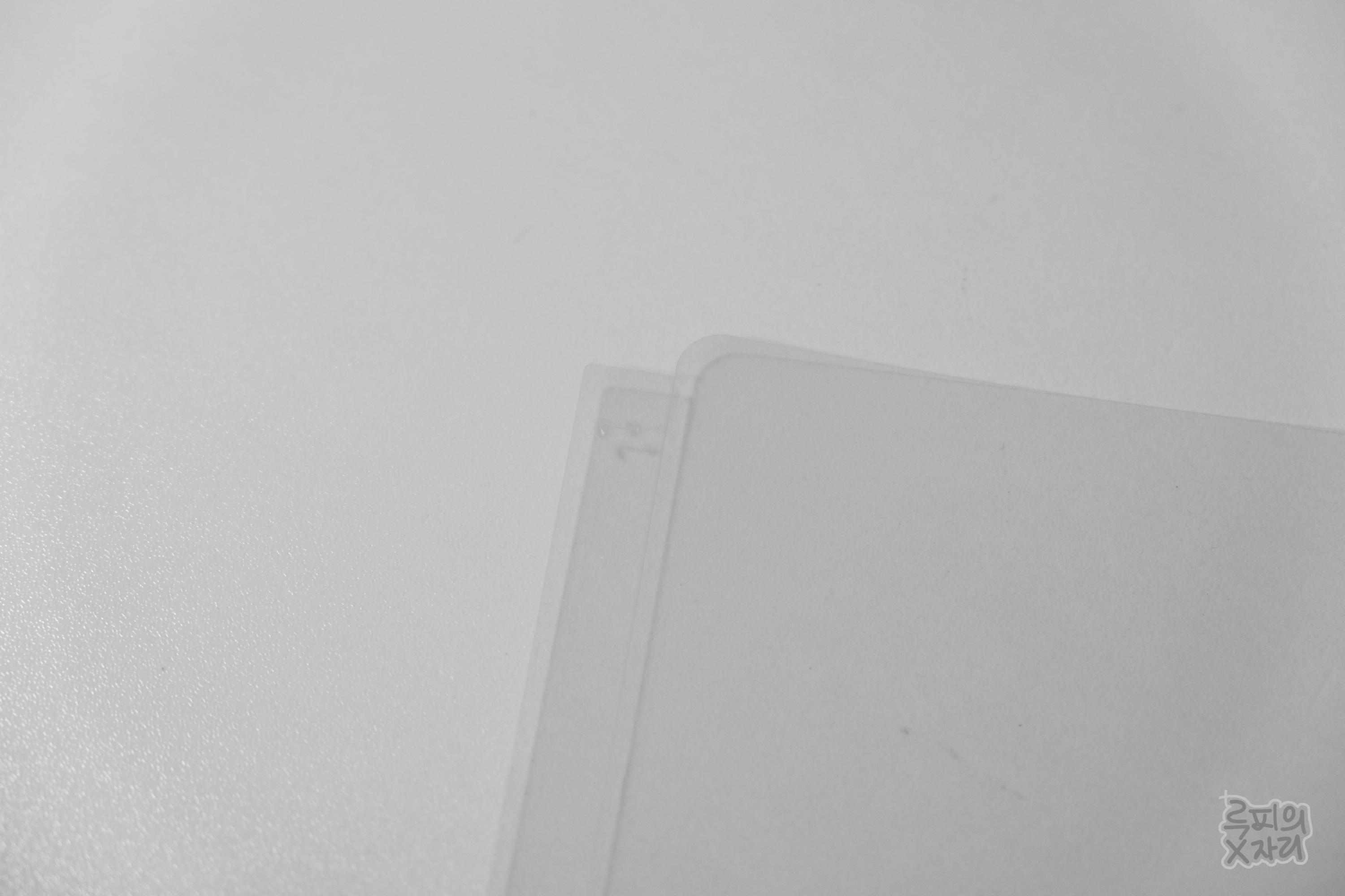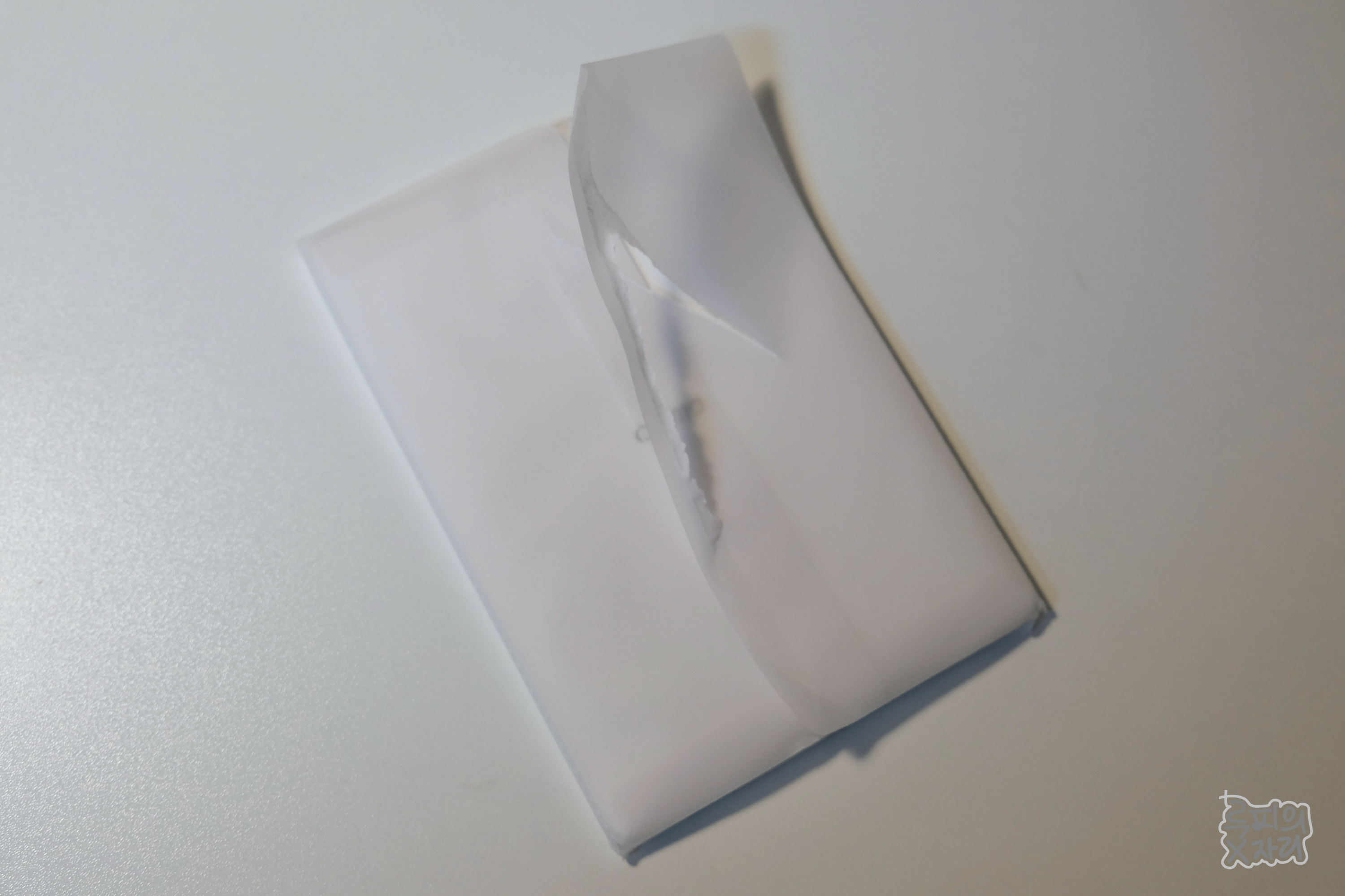 내부는 이런 구성. 1번을 떼어내서 화면에 붙인 후 2번을 떼어내는 방식이다. 부들부들하게 지문 방지 코팅이 되어있다. 후술 하겠지만 처음엔 기포가 생긴다.